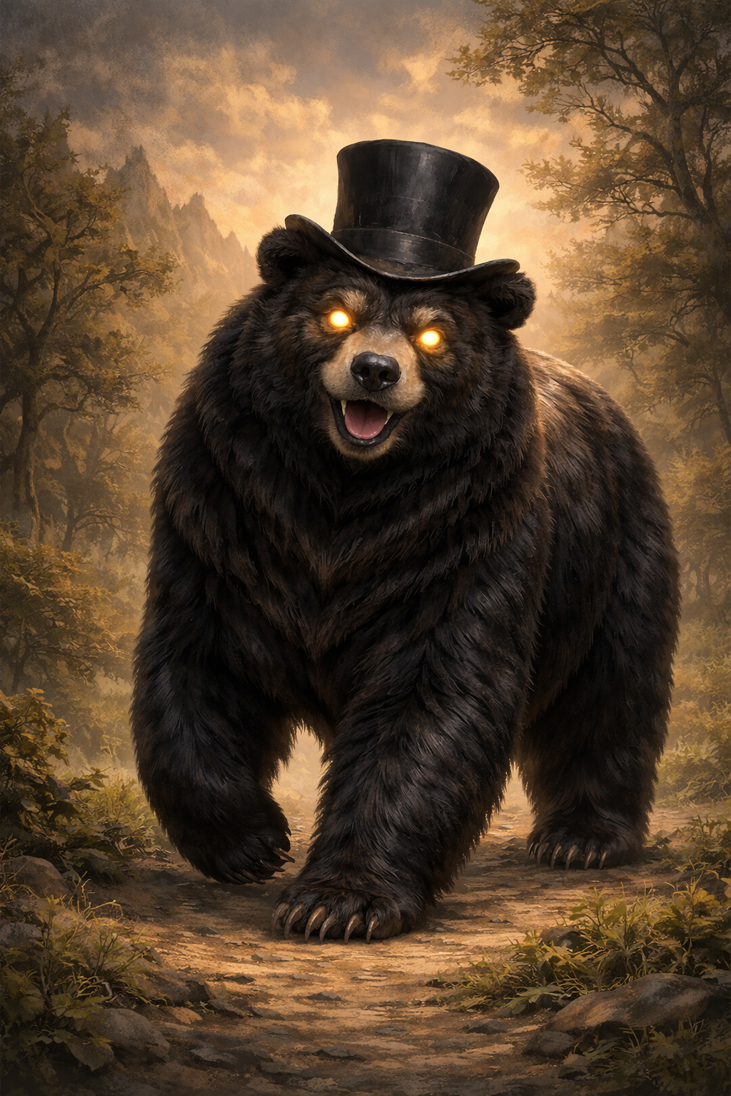 Trien was a great black bear, often depicted in imagery and poetry wearing a top hat. Folk barely remember him, let alone why he always seems to wear a hat. His smaller, black and brown descendants walk the orb, but rarely venture near towns and cities anymore.